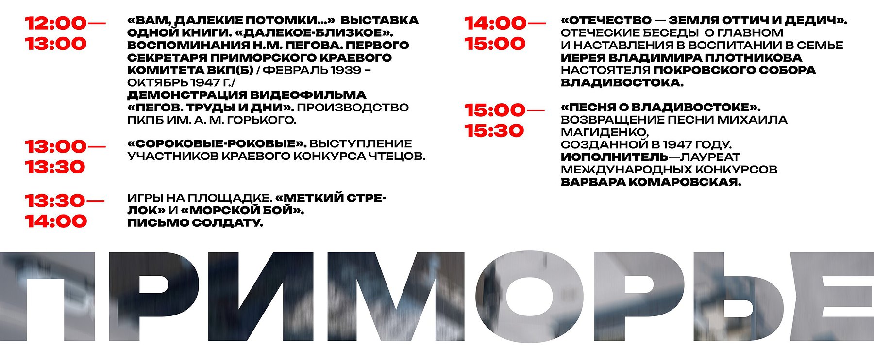 Приморская краевая публичная библиотека им. А.М. Горького подготовила для гостей познавательную программу «Приморье и его главный день», в которой представила выставку одной книги – воспоминания первого секретаря Приморского краевого комитета ВКП(б) с 16 февраля 1939 года по октябрь 1947 Николая Михайловича Пегова «Далёкое – близкое». Рассказ о книге руководителя края в годы Великой Отечественной войны дополнил показ видеофильма «Пегов. Труды и дни», созданного стараниями сотрудников Краевой библиотеки.