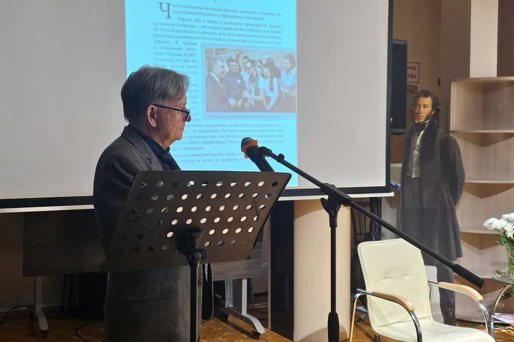 Могло показаться, что само название презентации как бы предполагает комплементарный настрой церемонии. Но ее ведущий – директор библиотеки Александров Брюханов, неожиданно начал с весьма острого вопроса: почему так непропорционально мало места в книге отведено Дальневосточному государственному университету, с которым автора связывали долгих 29 лет, 12 из которых в должности ректора?