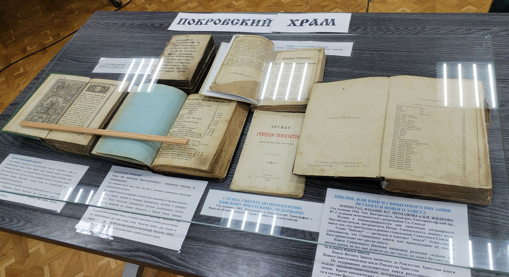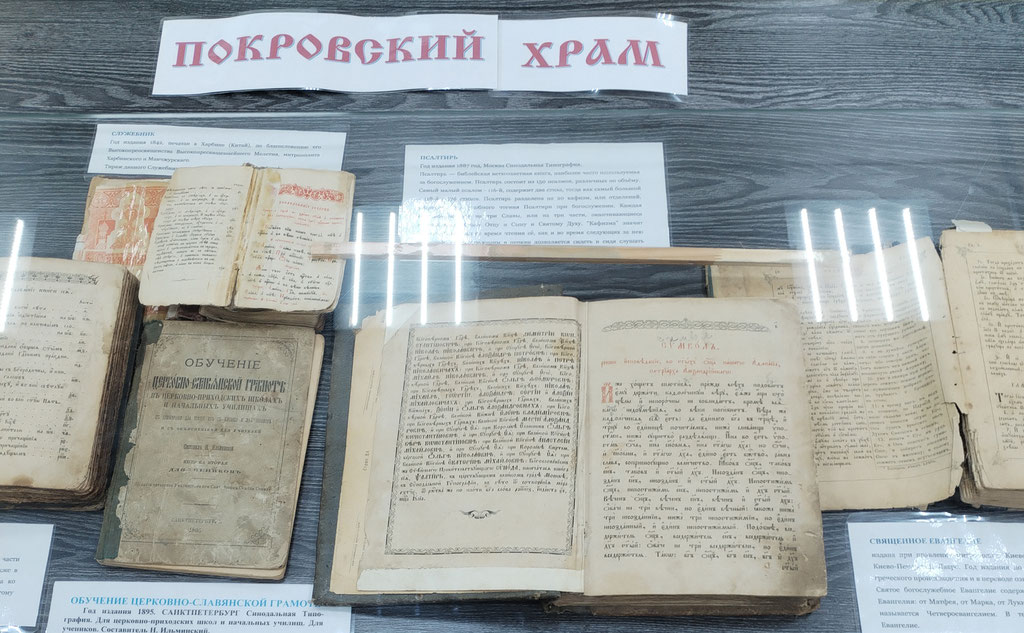 Всего на выставке был представлено 12 книг. В том числе «Служебник» или литургион – богослужебная книга славянских православных традиций, предназначенная для священника и диакона издания 1842 г.; «Месяцеслов» (святцы) — календарь с указанием имён святых, почитаемых Церковью. В нём для каждого дня года записаны имена угодников Божиих, в честь которых празднуют именины, изданный типографией Киево-Печерской лавры в 1866 г.; книга «песней» или «гимнов» Ветхого Завета «Псалтирь», изданная Московской Синодальной типографией в 1887 г.; учебник церковно-славянской грамоты 1895 г. и другие…