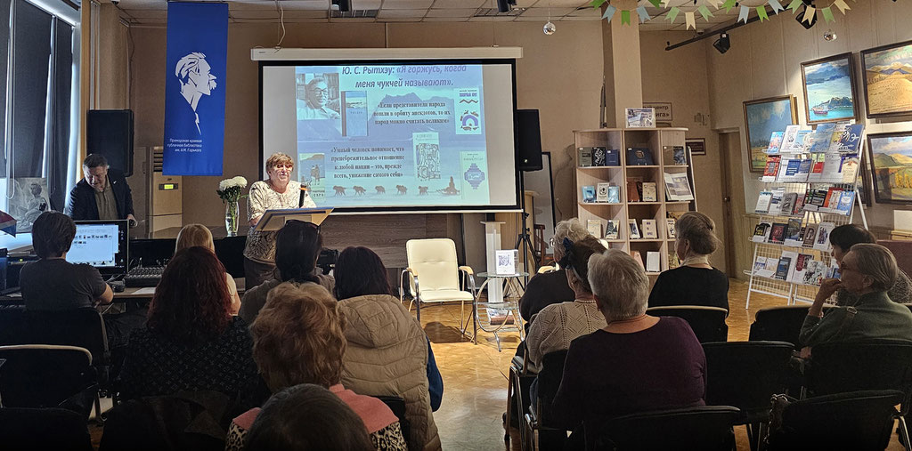 Директор издательства «Кордис» С. Склейнис (г. Санкт – Петербург) и заведующая библиографическим отделом Магаданской областной юношеской библиотеки Л. Шимова, представили совместный уникальный новый биобиблиографический указатель «Человек долгой весны», включающий в себя сведения о публикациях произведений Ю. Рытхэу и литературы о нем с 1949 по 2025 год. (1092 записи).