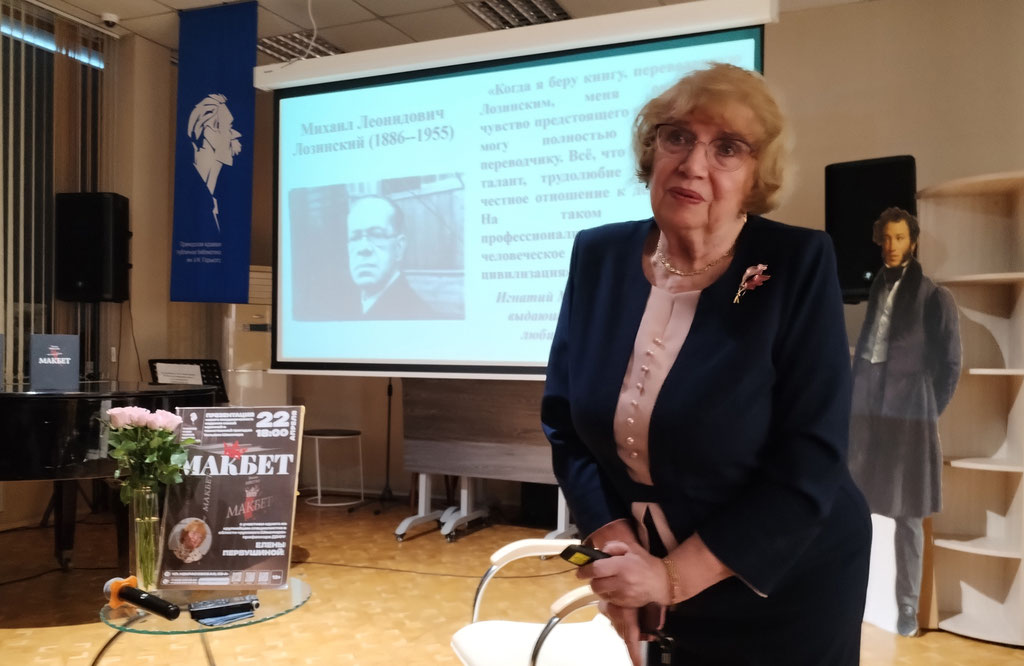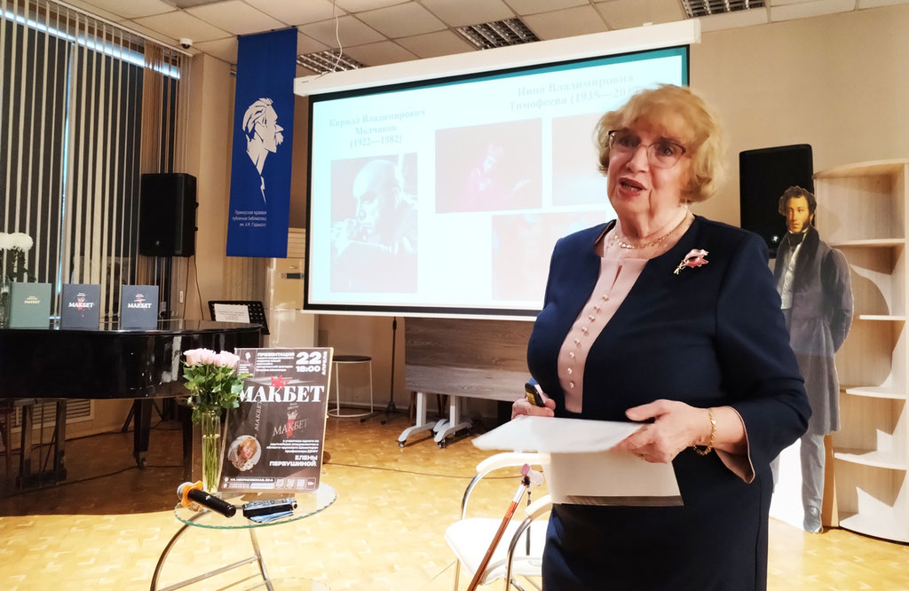 Наконец Елена Александровна подходит к приготовленному для нее журнальному столику и белому кожаному креслу, но, повернувшись к залу, остается стоять на этом «пятачке» все полтора часа своего выступления, увлекаясь сама и увлекая аудиторию рассказом о самом важном и дорогом в ее жизни – русских переводах Шекспира, в том числе «Макбета», и их авторах.