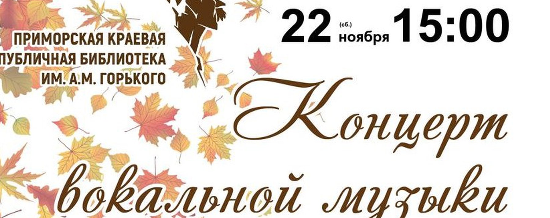 Приморская краевая публичная библиотека им. А.М. Горького приглашает своих читателей 22 ноября, а также жителей и гостей Владивостока, всех любителей классики на концерт вокальной музыки «Осенние мелодии».