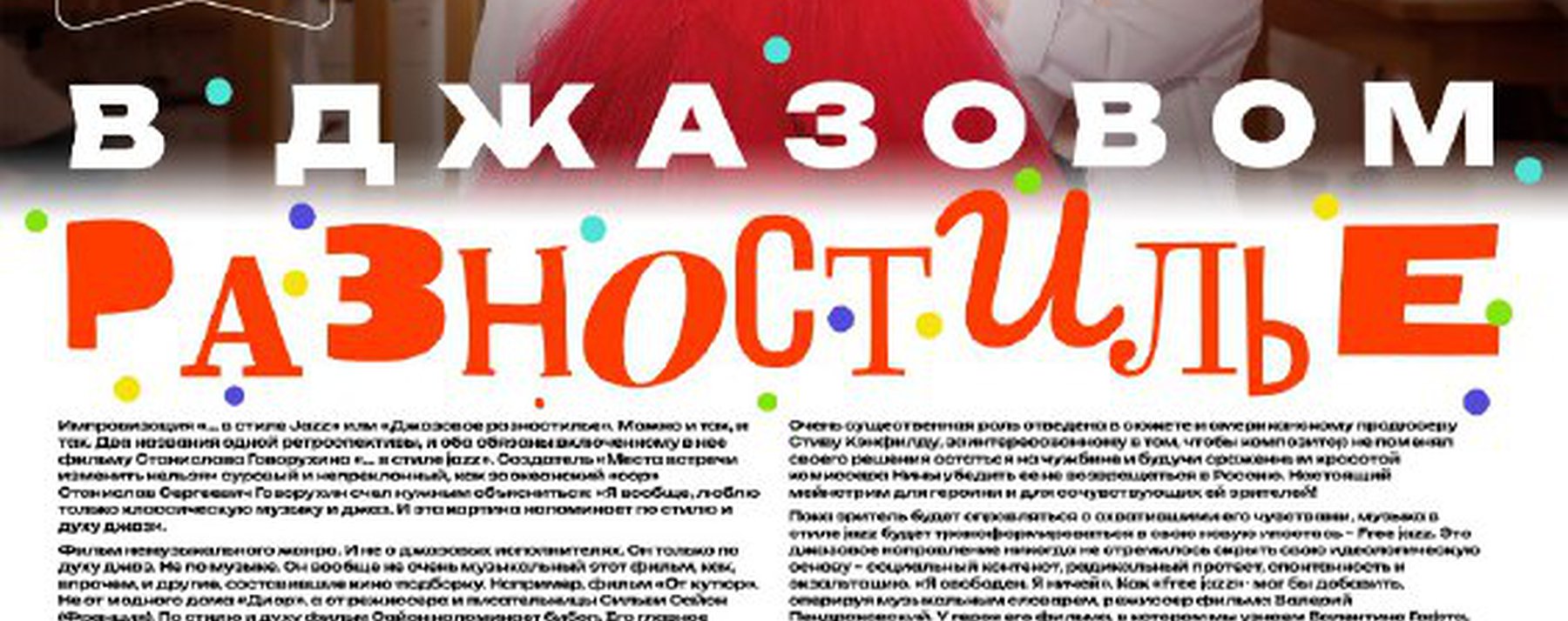 Импровизация «… в стиле Jazz» или «Джазовое разностилье». Можно и так, и так. Два названия одной ретроспективы, и оба обязаны включенному в неё фильму Станислава Говорухина «… в стиле jazz». Создатель «Места встречи изменить нельзя» суровый и непреклонный, как заокеанский «коп» Станислав Сергеевич Говорухин счёл нужным объясниться: «Я вообще, люблю. Только классическую музыку и джаз. И эта картина напоминает по стилю и духу джаз».
